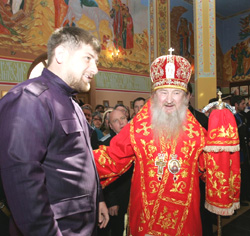 Архиепископ Феофан показывает Рамзану Кадыров внутреннее убранство храма Архангела Михаила. Грозный, 2009 год