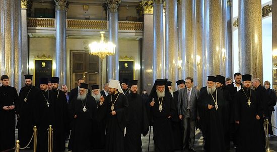 Блаженнейшего Владыку сопровождал председатель Отдела внешних церковных связей Московского Патриархата митрополит Волоколамский Иларион, ректор Санкт-Петербургской духовной академии и семинарии епископ Гатчинский Амвросий, секретарь ОВЦС по межправославным отношениям протоиерей Игорь Якимчук, члены делегации Элладской Православной Церкви.