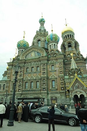 Затем Предстоятель Элладской Церкви посетил собор Воскресения Христова (Спас-на-Крови). Заведующая экскурсионным отделом храма-памятника Е.М. Монастырная преподнесла Его Блаженству цветы.