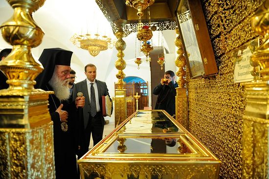 Затем Предстоятель Элладской Церкви проследовал в Малый собор монастыря, где находится гробница святителя Тихона и где в 1992 году были обретены его мощи.