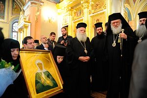 Далее Блаженнейший Архиепископ Иероним проследовал в Воскресенский храм обители; в храме игумения Феофания обратилась к высокому гостю со словами приветствия: «Мы сердечно рады сегодня приветствовать Вас в стенах древней московской Покровской обители, где ныне почивают мощи праведной блаженной Матроны Московской. Ваше Блаженство, для нас большая честь, что в насыщенную программу визита в Россию Вы включили посещение нашего монастыря… Мы, насельницы обители, являемся свидетелями ежедневных чудес и помощи святой Матронушки. Со всего мира приезжают православные поклониться мощам блаженной. Ее житие переведено на множество иностранных языков, включая греческий». Игумения пожелала Предстоятелю Элладской Церкви и сопровождающим его лицам «обильных щедрот от Господа, неисчерпаемых милостей и доброго здравия» и подарила на молитвенную память икону святой старицы и четки.