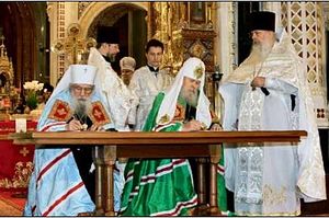 | Signing of the Act of Canonical Communion by Metropolitan Laurus and Patriarch Alexiy II in May 2008. |