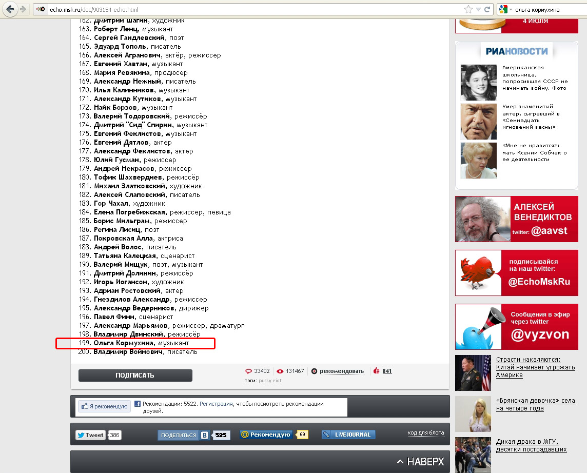 Напомним, что 27 июня 2012 года на сайте радиостанции «Эхо Москвы» было опубликовано «Обращение деятелей культуры и искусства РФ» в защиту участниц группы «Pussy riot», устроивших кощунственную акцию в московском кафедральном храме Христа Спасителя и ныне содержащихся под стражей.