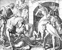 Взяв царскую печать, Иезавель от имени мужа пишет послание к старейшинам города, где проживал несчастный владелец виноградника: "Объявите пост и посадите Навуфея на первое место, и против него посадите двух негодных людей, которые свидетельствовали бы против него и сказали: "Ты хулил Бога и царя" А потом выведите его и побейте камнями, чтоб он умер".