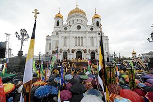 По окончании Литургии Святейший Патриарх Кирилл возглавил крестный ход вокруг Храма Христа Спасителя. На ступени северного входа в кафедральный собор был вынесен чудотворный Смоленский образ, перед которым Предстоятель Русской Церкви совершил молебное пение «ко Господу Богу в воспоминание избавления Церкве и Державы Российских от нашествия галлов и с ними двадесяти язык».