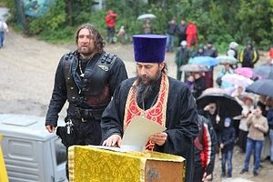 Колонна байкеров с иконой Богородских святых в сопровождении автомобилей ДПС проследовала по Горьковскому шоссе до расположенного в Ногинске храма блаженной Матроны Московской, где состоялся молебен. Сели на мотоциклы и представители духовенства - благочинный Богородского округа протоиерей Михаил Ялов и клирик Богоявленского собора Ногинска священник Илия Кунашов.