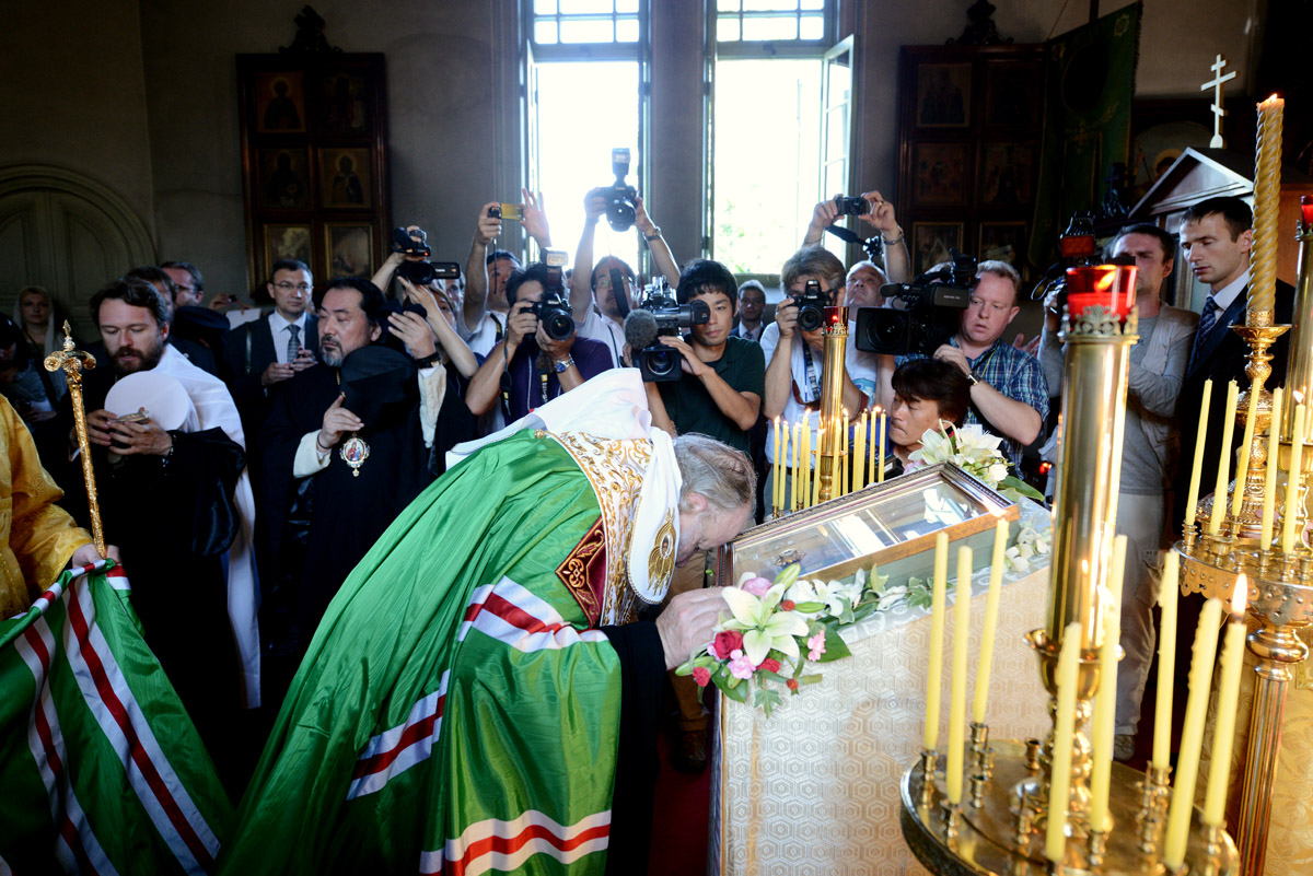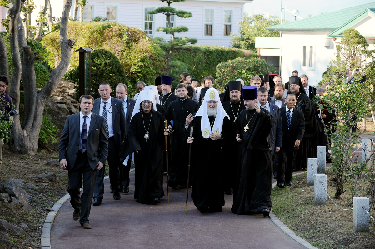 Проследовав в храм, где его ждали многочисленные верующие, Предстоятель Русской Церкви облачился в мантию и, поклонившись святыням алтаря, возглавил молебен святому равноапостольному Николаю. За богослужением молились иерархи и клирики Японской Автономной Православной Церкви, члены делегации, прибывшей в Японию вместе со Святейшим Патриархом.
