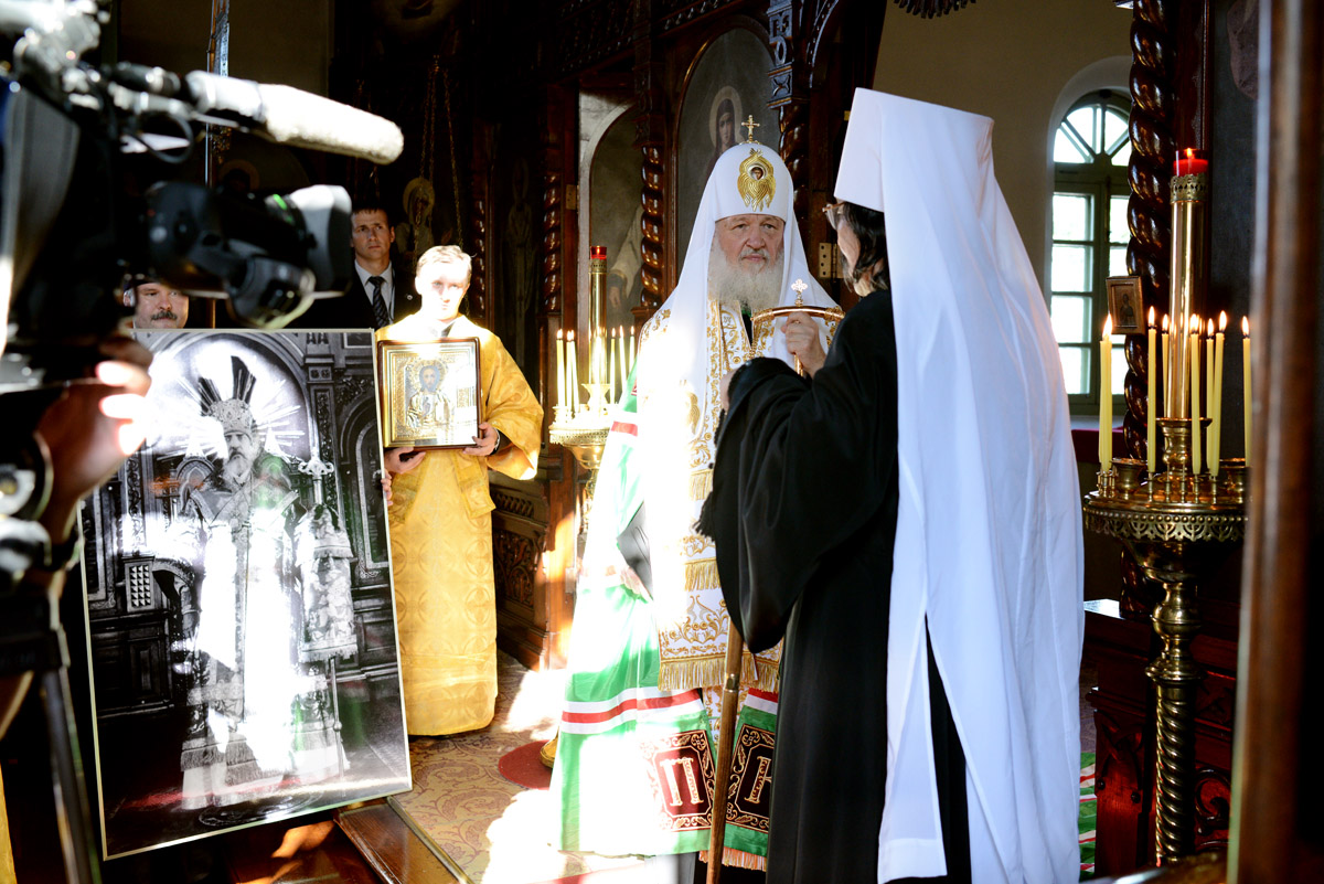 На память о посещении храма в Хакодате митрополит Даниил преподнес Святейшему Патриарху фотопортрет святого равноапостольного Николая.