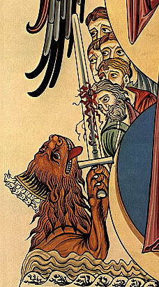 | Апокалиптический зверь с семью головами, выходящий из моря. На каждой голове его – имена богохульные. Фрагмент миниатюры Геррады Ландсбергской, конец XII века |