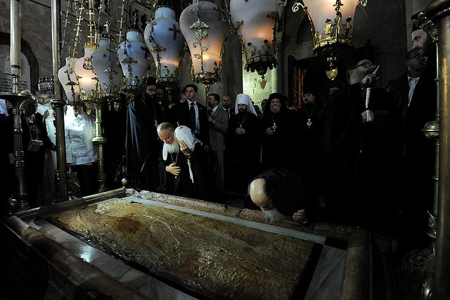 Воскресный день, малую Пасху, мы празднуем сегодня у величайшей святыни христианского мира — у Гроба Господня, в месте Воскресения Спасителя. Мы вместе служили Божественную литургию, вместе причащались от Единой Чаши. Наше духовное и молитвенное единство, единство Русской и Иерусалимской Церквей, имело сегодня свое зримое воплощение. И мне радостно приветствовать здесь Ваше Блаженство, а в Вашем лице — и всю полноту Святой Иерусалимской Церкви, сослужить и молиться вместе с Вами.
