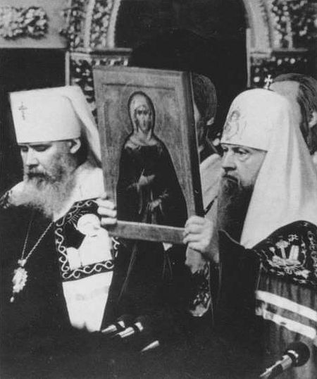 | Патриарх Пимен и митрополит Алексий на прославлении блаженной Ксении Петербургской |