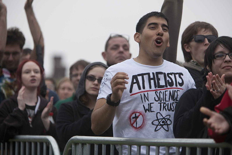 Среди выступавших был оксфордский биолог Ричард Докинс, автор книги «Бог как иллюзия», который утверждал, что «вера есть несомненное зло, потому что она не требует обоснования и не терпит споров». Христиане заражены «вирусом Бога», – говорит Докинс. Они уже не являются рациональными существами. Атеисты должны относиться к ним со смехотворным презрением. «Высмеивайте их», – прокричал Докинс. «Смейтесь над ними! Публично!»