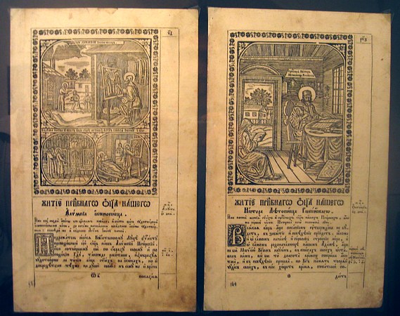 Самое раннее экспонируемое произведение в станковой гравюре – собор Киево-Печерских святых (конец XVIII – начало XIX в.). На многочисленных литографиях XIX века изображены преподобные Антоний и Феодосий, представлены виды Киево-Печерской лавры.