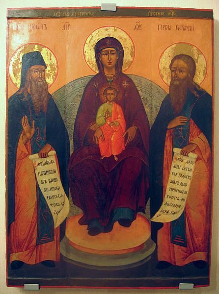 Сама иконография Печерской Богоматери со временем переносится на русскую почву. На выставке представлена замечательная икона северных писем с изображением тронной Богоматери, по сторонам которой стоят преподобные Зосима и Савватий Соловецкие, основатели Соловецкого монастыря (XVIII в.).
