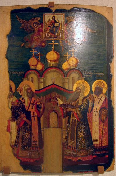 – Вероятно, здесь можно говорить о соединении двух традиций: с одной стороны, афонского особого почитания, с другой – влахернского благословения на строительство храма. Можно даже предположить преобладание Константинопольской линии, выражавшейся в том, что на Руси во множестве строились именно Успенские храмы, по образу и подобию печерского. Так, на выставке представлена икона с изображением Московских митрополитов Петра, Алексия, Ионы и Филиппа на фоне московского Успенского собора (XVIII в.).