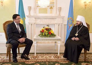 Митрополит Волоколамский Иларион рассказал руководителю Агентства по делам религий о состоявшихся визитах к председателю Сената Парламента Республики Казахстан К.А. Мами и министру иностранных дел страны Е.А. Идрисову. Собеседники обсудили особенности религиозной ситуации в республике. В частности, были затронуты различные вопросы взаимодействия агентства с руководством Митрополичьего округа в Республике Казахстан, сообщает служба коммуникации ОВЦС.