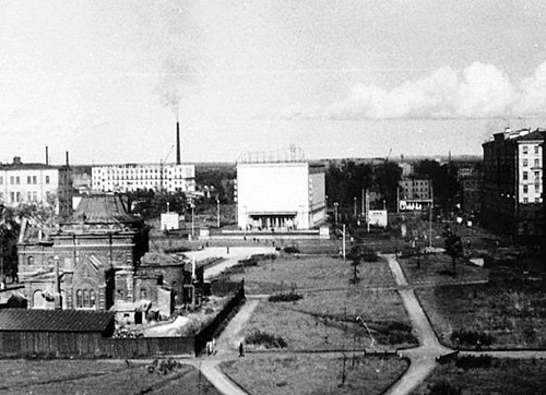 | Коробка без окон на дальнем плане — кинотеатр «Спутник», построенный в 1955-1965 годах. Часть кладбища сровняли с землей и водрузили кинотеатр прямо поверх могил. Церковь уже обнесена забором, кресты сняты и купол частично разобран |