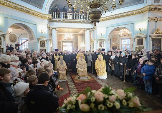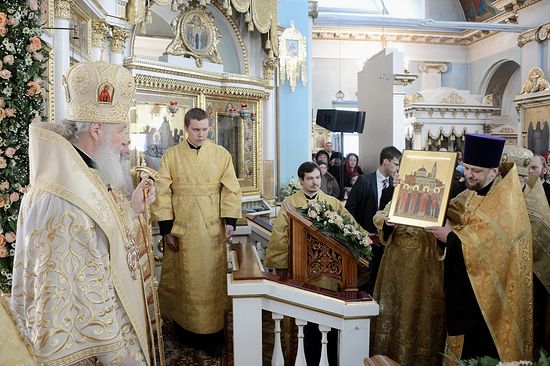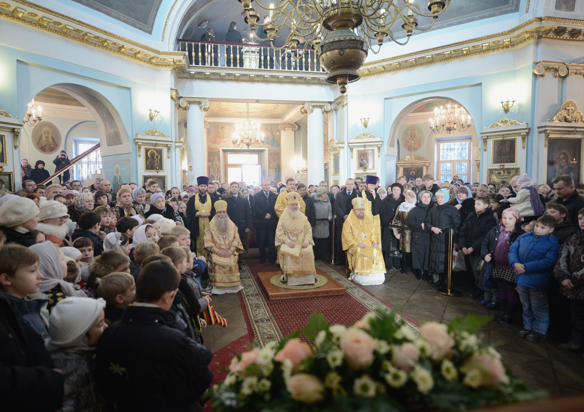 По прибытии Святейший Патриарх поклонился главной святыне Успенского храма — чудотворной иконе Божией Матери «Косинская».