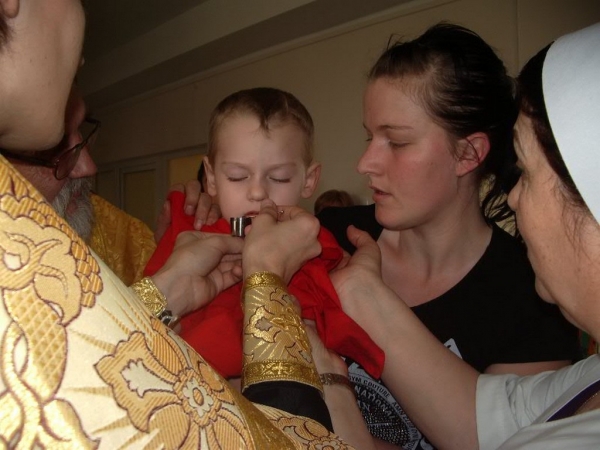 По окончании освящения было совершено причастие Святых Тайн Христовых девятерых детей.