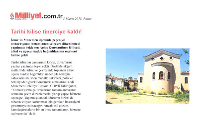 В статье, вышедшей в турецкой газете «Милльет» 5 мая и рассуждающей о причинах столь плачевного положения дел, говорится о том, что церковь святого Константина в городе Менемени, которая в силу своей исторической и культурной значимости в последние годы была отреставрирована, чтобы привлекать туристов, в основном греков – потомков выходцев из этих мест, была постепенно заброшена.