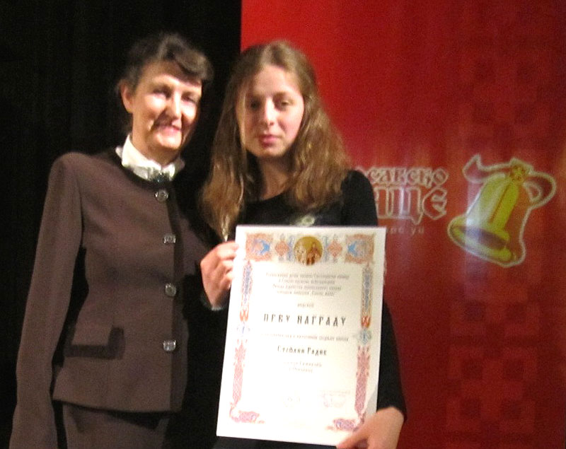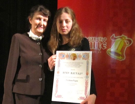 - Својски смо се трудили и желели да наградимо много више учесника, али како су награде заиста вредне (летовање у Грчкој, преносиви рачунари-лап топови, фотоапарати и годишњак Светосавског звонца у кожном повезу са златотиском), ни ми, а ни суорганизатори, руски Међународни фонд јединства православних народа, нисмо имали више средстава. Радује ме што по избору жирија прву награду за литерарни рад у категорији средњих школа са Наталијом Коцић из Ниша, дели ученица са Косова и Метохије, из Ораховца, Стефана Радић. Она је други разред ораховачке Гимназије, а како ми је у телефонском разговору, директор Гимназије, Јован Левић, рекао, то је и прва награда за литерарни рад коју је добила њихова Гимназија. Стефана је написала састав о мајци Лазара Кујунџића, Јованки (Ванки Кујунџић), а њена награда је путовање на острво Крф у Грчкој, и десетодневни боравак у одмаралишту Српске православне цркве.