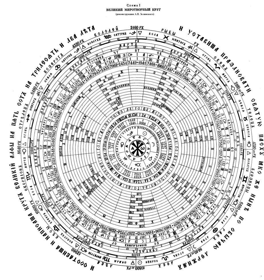 Миротворный круг юлианского календаря представляет собой совершенное творение в области летоисчисления, гармонично сочетающее в себе систему религиозных, астрономических и гражданских аспектов измерения времени. А.Н. Зелинский наглядно представил Миротворный круг в виде круговых таблиц (см. рис.), по которым без сложных вычислений определяется дата Пасхи. Шкала Миротворного круга простирается в прошлое и будущее, отражая вечное круговое течение времени и циклическую повторяемость астрономических явлений по числам юлианского календаря.