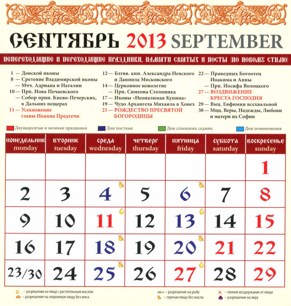 Заметим, что церковный год начинается не 1 января (и даже не 14-го), а 1 сентября по юлианскому календарю, или 14 сентября по принятому теперь григорианскому («новому стилю»), и потому заканчивается он соответственно 31 августа (13 сентября). Поэтому первый большой праздник церковного года – Рождество Богородицы (8/21 сентября), а последний – Ее Успение (15/28 августа) – переход из временной жизни в вечную. Во временных границах, обозначенных двумя этими событиями, протекает год жизни православного христианина, который должен быть наполнен для него глубоким духовным содержанием и смыслом.