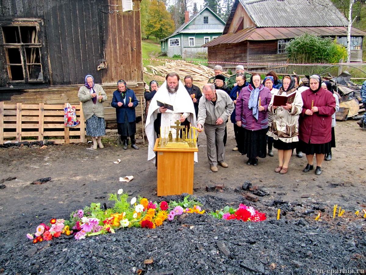Телефонирали смо у Малу Вишеру старешини храма светитеља Николаја, протојереју Димитрију Шкоднику, који је служио парастос на рушевинама психонеуролошког интерната „Оксочи“ који је изгорео у пожару.