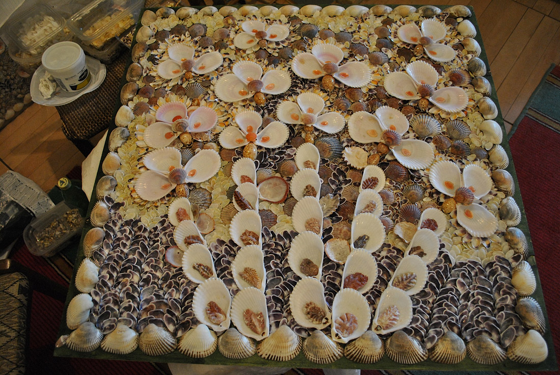 Набрав ракушек, отец Димитрий стал подбирать их по окраске, а потом складывать картины. Сначала это были цветы. Сейчас панно с цветами уже более 150. Затем он перешел к библейским сюжетам. Чада стали привозить батюшке ракушки из всех стран мира. Количество работ росло, и встал вопрос о том, чтобы поместить часть из них в галерею, так как в доме для них не хватает места.