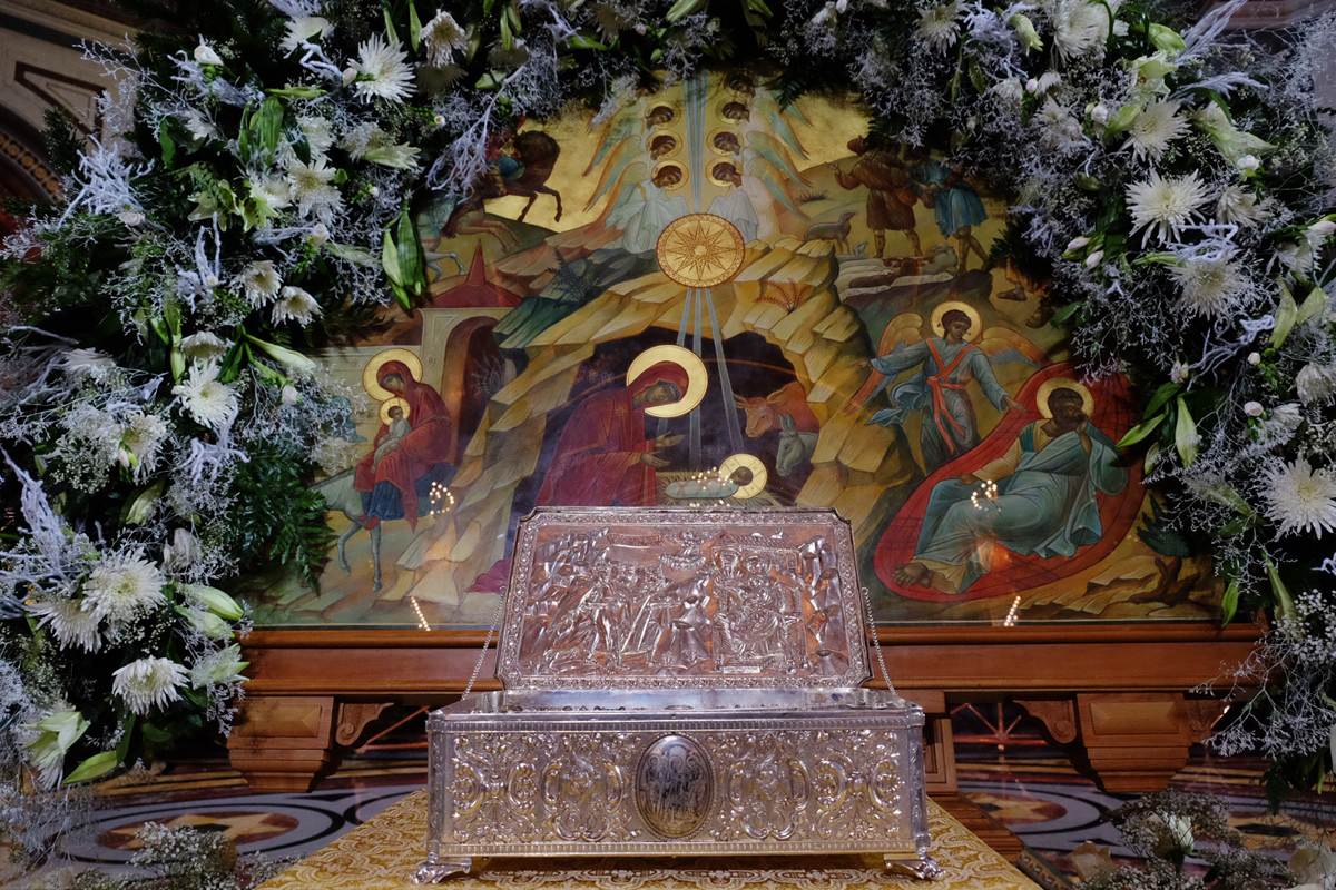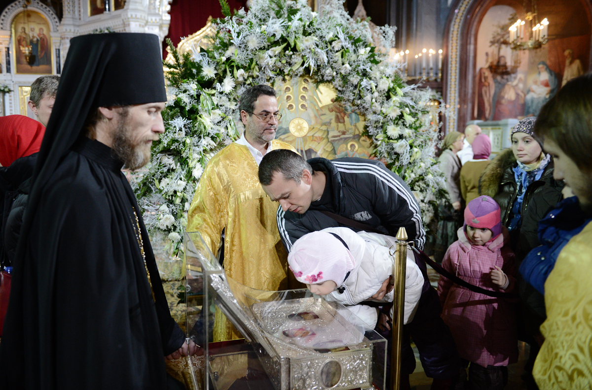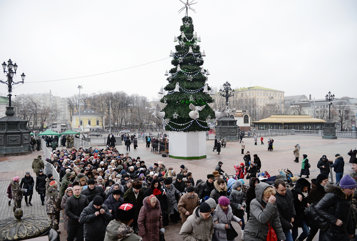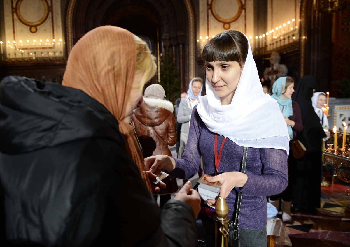 Волонтеры, стоящие «на выходе», поздравляют всех с Праздником Рождества Христова, следят, чтобы никто не задерживался, продолжал движение к выходу из храма. Людям, уже приложившимся к святыне, свойственна некоторая «оторопь», и от соприкосновения со святыней, и чисто психологическая — прикосновение к Дарам для них, как глоток ключевой воды после долгого пути к источнику. Возле него хочется расслабиться и отдохнуть. Но человеческий поток не прекращается весь день, и если остановить движение хоть на минуту, то уже через две минуты яблоку негде будет упасть. А люди в порыве благодарности, конечно, об этом не догадываются. Некоторые, отойдя, замирают в растерянности, потому что не успели освятить принесенные с собою иконочки или ленты со словами 90 псалма «Живый в помощи», молитвословы, платки…