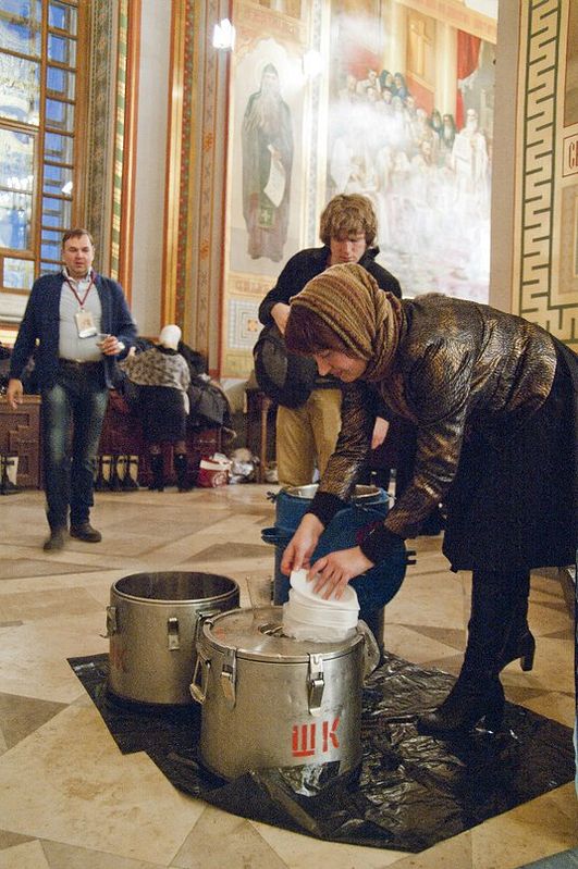 В «волонтерской» веселый гам — первая смена общается с вновь прибывшими. Кто-то давно знаком, да и с незнакомыми людьми разговор завязывается на удивление легко. Нас кормят гречневой кашей с мясом, есть чай. Потом ведут приложиться к святыне. Я еще долго не могу уйти. Выясняется, что это присуще всем волонтерам. Поработал, устал, но уйти невозможно. Чем больше работаешь, тем больше сил.