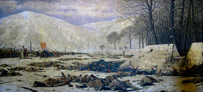 К картине Верещагина 1877 года «Побежденные. Панихида», воспроизводящей конкретный эпизод под Телишем, которому Верещагин был свидетелем, на выставках 1880-1883 годов был оставлен такой отзыв: «Нет в его картинах ни победно шумящих знамен, ни сверкающих штыков, ни блестящих эскадронов, несущихся на пылающие огнем батареи, не видно торжественных шествий, поднесения трофеев, ключей и пр. Вся та парадная, увлекательная обстановка, которую человечество измыслило для прикрытия пагубнейшего из своих деяний, чужда кисти г. Верещагина; перед вами голая действительность». Это действительно одно из самых впечатляющих полотен художника, процитированное кинорежиссером Н. Михалковым в изобразительном ряду фильма «Утомленные солнцем. Цитадель» — в эпизоде обороны Москвы 1941-го года. Мы видим, что благодаря перетеканию полутонов неба, земли и снега, павшие словно врастают в земную плоть. Один из европейских критиков заметил, что в этой картине «есть что-то, уподобляющееся видению Иезекииля».