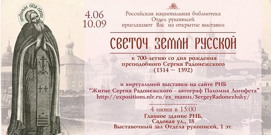 Комплексный выставочный проект осуществлен Российской национальной библиотекой в соответствии с Указом Президента Российской Федерации "О праздновании 700-летия со дня рождения преподобного Сергия Радонежского".