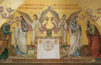 Символическое изображение вневременной небесной Евхаристии, традиционно украшающее алтари православных храмов: апостол Павел, которого не было на Тайной вечере, причащается одновременно с Петром; Христос как в Теле (хлебе), так и в Крови