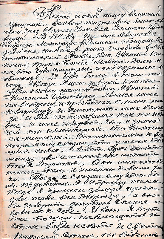 «Нечто и о себе пишу великий грешник. За свою жизнь мне было явлено через Святого Николая Великого Чудотворца. В 1911 году. Он мне явился с Божею Матерью видимым образом. Среди дня на небе в рост человека в Святительской одежде. Как Святый Николай так и Божья Матерь. Долго я на это чудо смотрел и оне скрылись в облаках.