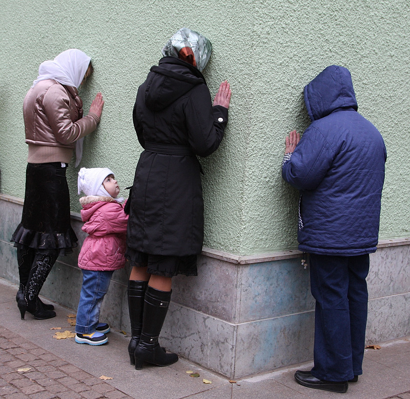 – Не знаю, о чем молиться? – жалобно сообщила женщина впереди своему мужу.