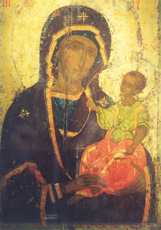 Дело в том, что иконография этой иконы совершенно уникальна. По ошибке ее некоторое время называли Грузинской из-за распахнутого на груди мафория, открывающего уголок туники Божией Матери. Она отличается от традиционной иконографии Одигитрии положением правой руки Богородицы: лежит на ножках Богомладенца, как на иконе "Богоматери Римской" или иконе "Млекопитательницы". Отличается позой Младенца, Его одеждами. И самое, казалось бы, неприметное отличие - благословляющая правая рука Младенца. Она полностью совпадает с каймой мафория! Богомладенец как бы сокрывает Себя, а являет нам Матерь Свою. Иконописец не повторил бы этого. Повторила это какая-то фототехнология. Поверх этой копии написаны глаза. Но об этом позже.