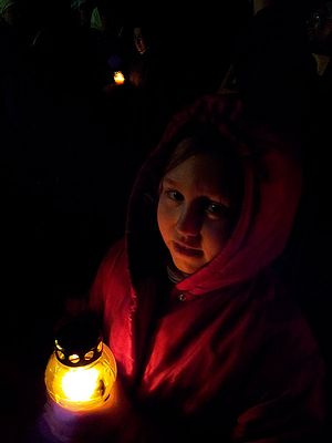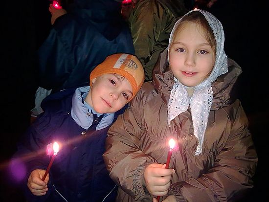В руках детей фонарики со свечками. Светятся окна храма. Огни вокруг мерцают, ярко сверкают звезды в темном небе. Еще полчаса назад шел дождь, шел, не переставая, несколько дней подряд. Мы одели куртки с капюшонами, кто-то плащи, некоторые даже приготовили зонтики, чтобы не намокнуть во время крестного хода. И вдруг, выйдя из храма, мы видим звезды, над храмом повисла яркая, почти полная луна. Не чудо ли? В глазах детей удивление и восторг!