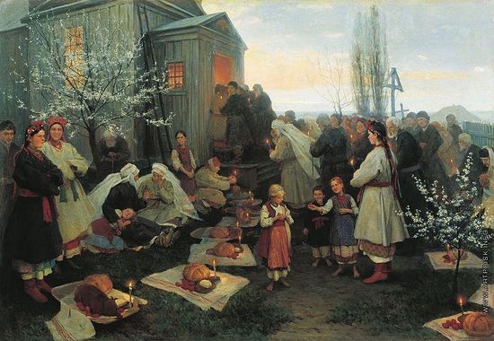 Во-вторых, собственно о куличах. Сектанты в подтверждение своих измышлений приводят фотографии исключительно вертикальных куличей, а всё вертикальное у них ассоциируется строго по Фрейду. Между тем классическая форма кулича – горизонтальная. Хотя сейчас куличи пекут разных форм, даже в виде фигурных кексов, на картинах русских художников XIX века, посвященных Пасхе, мы видим только куличи горизонтальной формы[1], куличи вертикальной формы появляются только на картинах ХХ века.