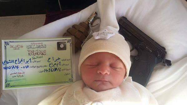 Однако в целях пропаганды исламистами используются даже невинные новорожденные младенцы. В воскресенье двадцать шестого апреля в социальную сеть Twitter попала фотография ребенка, сделанная на фоне положенных в люльку пистолета, гранаты и свидетельства о рождении, выданного, в свою очередь, «Алеппским вилаятом» ИГ. Абу Вард ар-Раккави, активист из Ракки, выложивший вышеупомянутый снимок в Интернет, считает, что снимок призван служить устрашением для всех врагов «Государства». «Этот ребенок опасен для вас, а не только для нас», - гласит подпись к фотографии, вызвавшей бурный резонанс в мировом информационном пространстве.