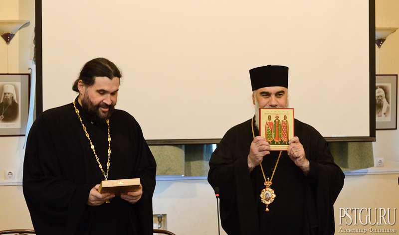 Протоиерей Георгий Ореханов горячо поприветствовал гостя и передал митрополиту Серафиму икону святого равноапостольного князя Владимира и святых страстотерпцев Бориса и Глеба и университетские сувениры. Владыка Серафим сердечно поблагодарил за внимание и преподал благословение собравшимся, пожелав успешной работы только что родившемуся Клубу «ПСТГУ-Грузия», пригласив всех его участников совершать паломнические поездки к древним святыням грузинской земли.