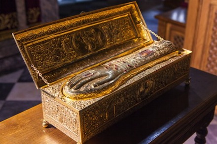 Ковчег с десницей мощей великомученика Георгия Победоносца прибыл в Россию из афонского монастыря Ксенофонт 24 апреля. Его принесение приурочено к празднованию 70-летия Победы в Великой Отечественной войне. На данный момент святыня уже побывала в Ярославле, Москве, Ставрополе, Элисте, Волгограде, Белгороде и Краснодаре. По окончании пребывания в Подмосковье, мощи будут направлены в Санкт-Петербург, Смоленск, Тулу и Екатеринбург.
