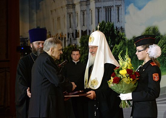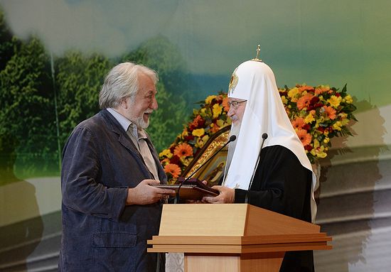 Затем на сцену были приглашены номинанты премии, которым Святейший Патриарх Кирилл вручил грамоты и памятные подарки.