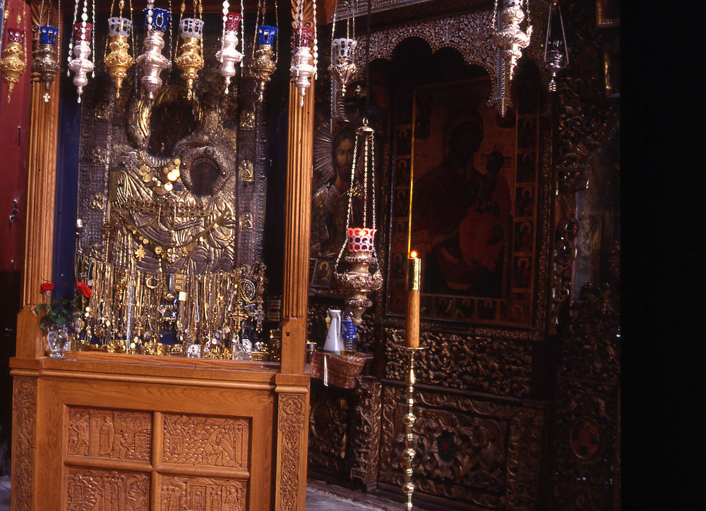 Zura: There were some other miracles as well. For example, we had intended to go to some monasteries, but everything transpired differently. Nothing was happening according to plan, everything happened by the will of the Mother of God. In the end we found out that the route we traversed was in the shape of a cross. The Virgin Mary visited all the places where they needed her. We must tell you that in every monastery the icon was in the altar during the night. Besides that the icon was placed on the greatest miraculous icons, as well as on other holy relics on Mount Athos, and received their mercy and power. It is hard to count all of them, but I will mention some: the “Pantanasa,” Dochariou’s "Gorgoepikoos" ("She who is Quick to Hear [Prayers]"), Hilandar’s Trojeručica ( "Three-handed Theotokos"), and “It is Truly Meet” icons. And other sacred things: the belt of the Virgin Mary, the skull of St. John Chrysostom, the skull of the Apostle Andrew, pieces of the True Cross on which Christ was crucified, and many others. From all these holy things our “Queen” icon had gathered mercy and power.