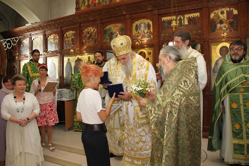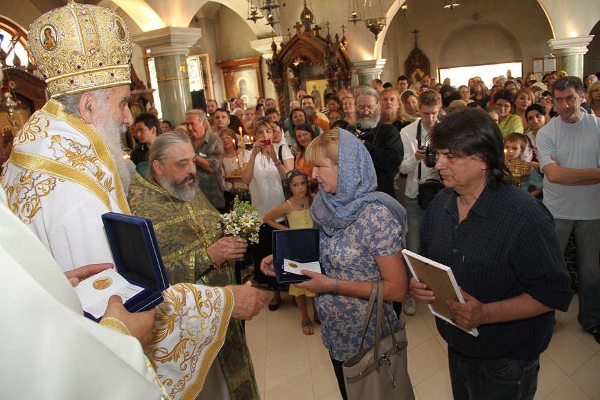 Затим је патријарх Иринеј по први пут уручио медаље и српским породицама које у љубави и сагласју, као Петар и Февронија, живе најмање двадесет пет година. Овом приликом је истакао да је велика радост служити у руском храму, који је и наш храм, као што су и наши храмови, храмови свих православних хришћана, а још већа је радост служити на данашњи празник посвећен породици, деци, брачној љубави. Патријарх је подсетио на прву брачну заједницу наших прародитеља и Божју заповест: - Рађајте се и множите се, напуните земљу и владајте њоме. Рађање деце није ствар људска, него ствар Божја. Преко родитеља Господ је узео себи сараднике у највећем дару, дару живота. Може човек данашњег развоја да измисли не знам шта све, да полети до друге планете, да измисли савршену направу као што бива, али живот, највећи дар Божји, могу дати само родитељи, сарадници Божји.
