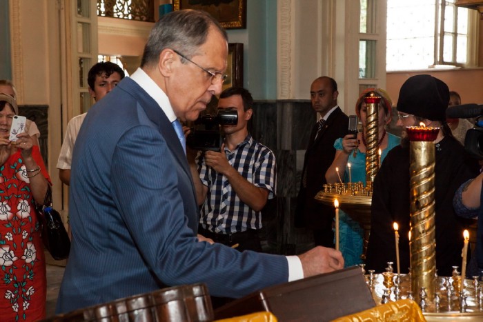 Митрополит Ташкентский и Узбекистанский Викентий, глава Среднеазиатского митрополичьего округа сразу после приветствия провел экскурсию по Свято-Успенскому кафедральному собору, кратко рассказал об истории храма и святынях, которые в данный момент находятся здесь. Сергей Лавров приложился к старинной иконе своего небесного покровителя преподобного Сергия Радонежского с частицей его святых мощей и поставил свечку, сообщает сайт Ташкентской и Узбекистанской епархии.