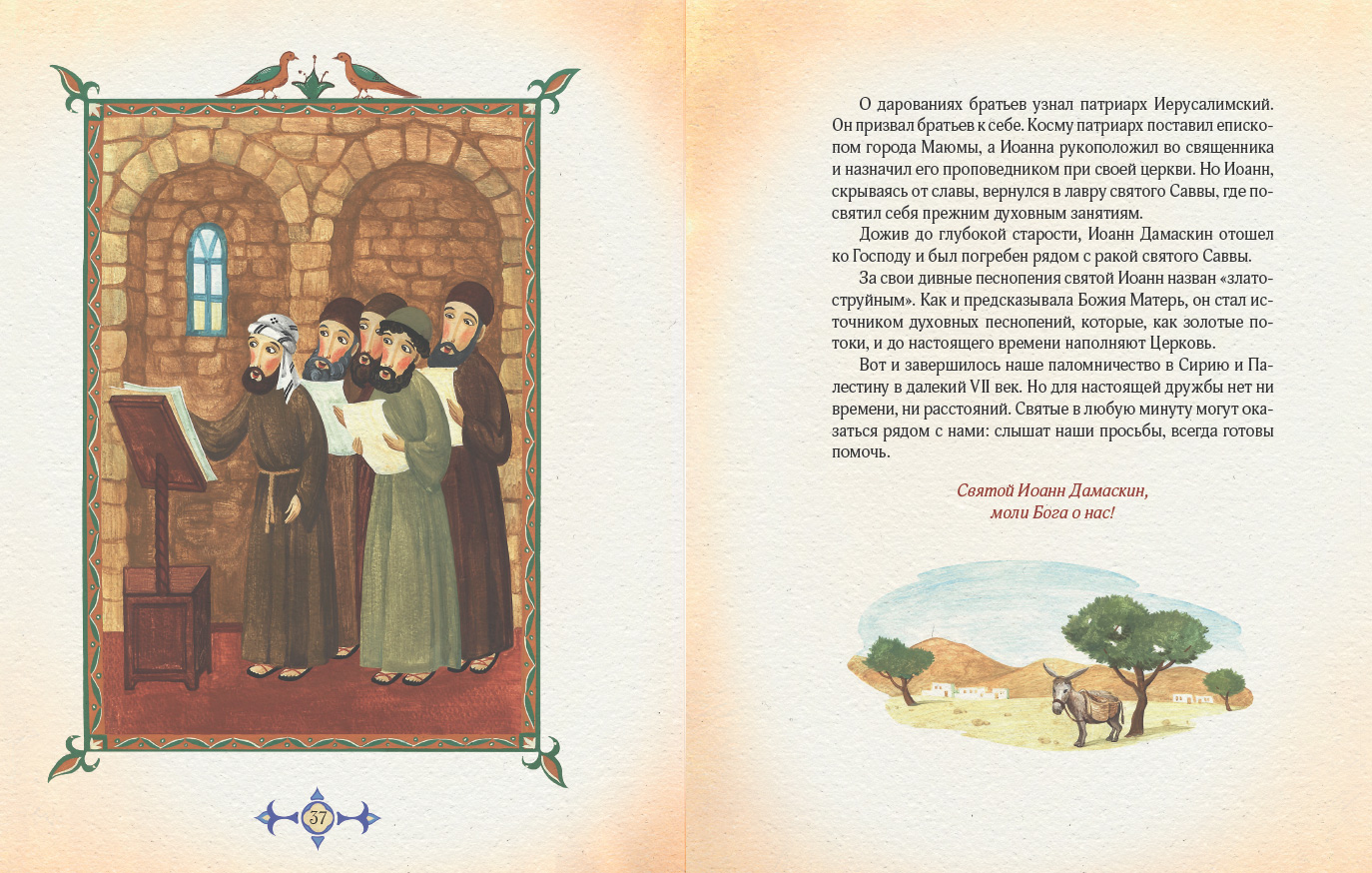 Судакова И.Н. Иоанн, святой из Дамаска / И. Н. Судакова; Худож. Е. А. Цымбаревич. — М.: Изд-во Сретенского монастыря, 2015. — 40 с.: ил. Перед читателями предстает живой образ преподобного Иоанна Дамаскина, великого писателя и замечательного поэта VIII века. За написанные им дивные песнопения святой Иоанн назван «златоструйным». Как и предсказывала Божия Матерь, он стал источником духовных песнопений, которые, как золотые потоки, и до настоящего времени наполняют нашу Церковь.