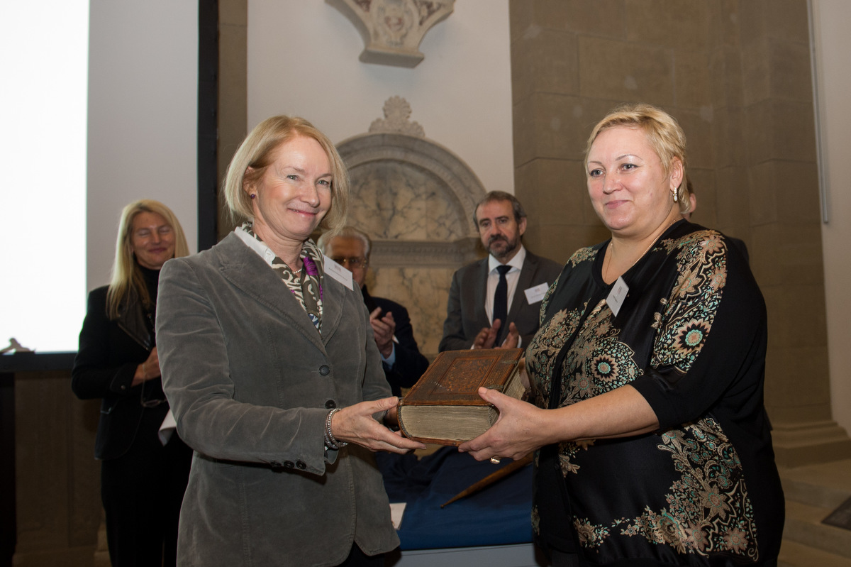 "Передача книги состоялась в Берлине на международном форуме, посвященном 10-летию германо-российского музейного сотрудничества. Генеральному директору ГМЗ Наталье Григорьевой книгу передала руководитель Берлинской государственной библиотеки Барбара Шнайдер-Кемпф", - сказал собеседник агентства.