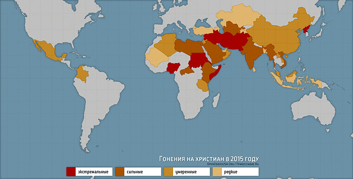 В статистике гонений организации «Open Doors» за 2015 год Ирак и Сирия оказались на 3-м и 4-м местах соответственно[4], что говорит об экстремальном уровне преследований. По данным организации, каждый месяц в мире за веру гибнет 322 христианина, уничтожается 214 церквей и христианских зданий, против христиан совершается 772 различных формы насилия[5].