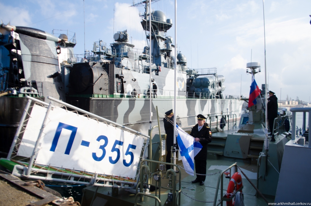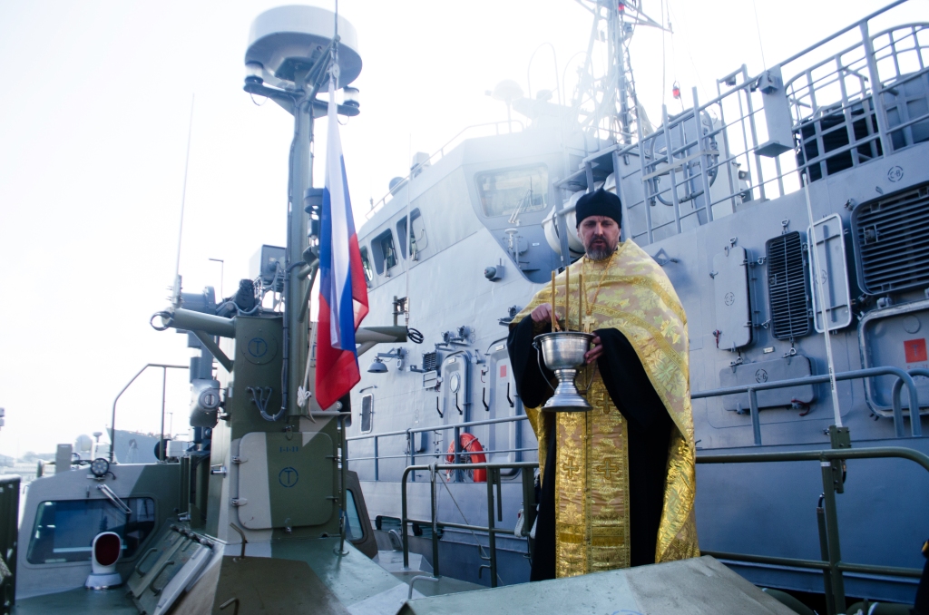 Перед подъемом флага помощник командующего ЧФ по работе с верующими военнослужащими, протоиерей Александр Бондаренко совершил чин освящения воинского знамени. Священник также освятил катер и поздравил моряков с наступающим праздником – Днем защитника Отечества.